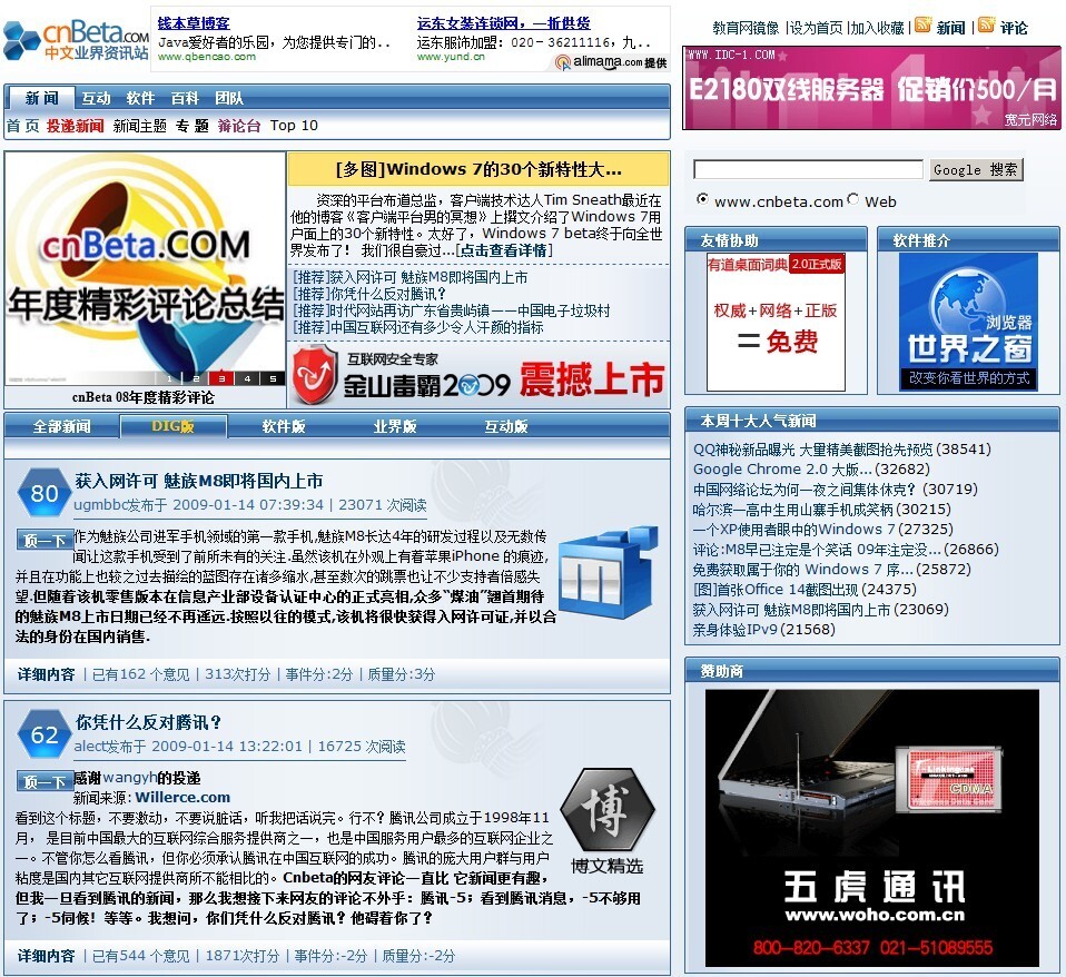 虽然cnBeta只有IT相关的新闻,但它也是将Digg思路(顺应民意)贯彻的非常好的一家网站。重视投递机制、文章打分和评论交互,让cnBeta逐渐形成了一套自己的文化。这几年,从窄众,走向大众,CnBeta几乎是国内IT从业人员必看的“民间媒体”之一,尤其是其针砭时弊的评论,通俗、幽默却又一针见血。