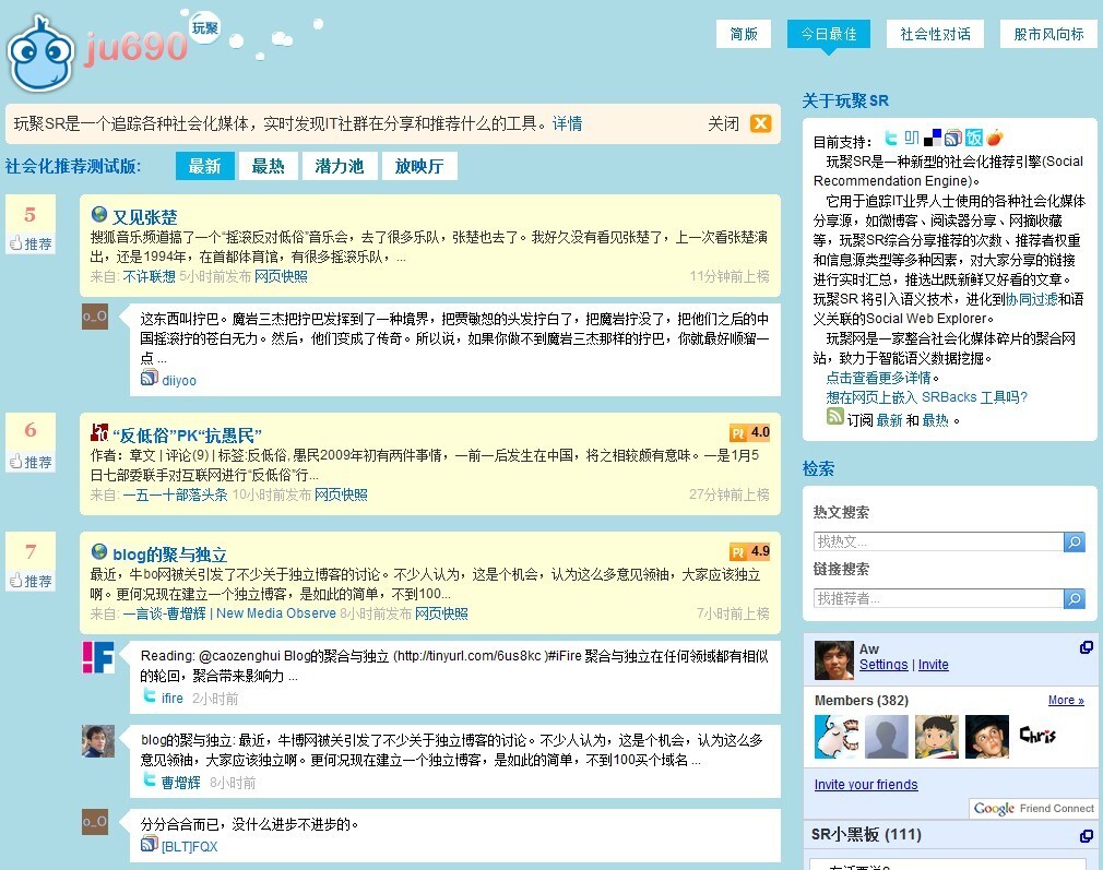 说实话,我向来对简单的mashup类聚合不感冒。但玩聚这次推出的社会化分享引擎(SR),确实让我有了耳目一新的感觉。不过,个人觉得玩聚的内容源似乎和鲜果热文有一些重复,而且mashup进来的信息量太大,例如同时引入了推荐书和PostRank的概念,让不太了解这些概念的用户容易犯迷糊。